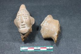 | Description / विवरण | Human figurine with projected head, prominent facial features and linear motif on forehead having rough surface. |