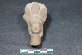 | Description / विवरण | Head of a Human figurine with prominent head gear marked by petal motives and facial features having rough surface. |