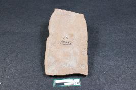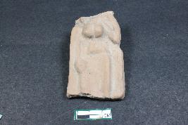 | Description / विवरण | Plaque of a female figurine with prominent bust, one hand placed on leg and other on shoulder having rough surface. |