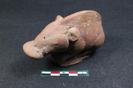 | Description / विवरण | Rattle depicting Animal figurine with in a sitting posture on a pedestal with prominent facial features and rib having smooth surface. |