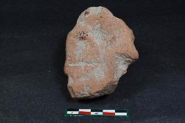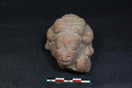 | Description / विवरण | A head of godness with eyes depicted by incised lines , its nose and mouth are damaged and ear are partially broken and have kundala , wavy hair and have rough surface. |