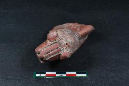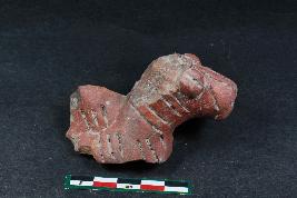 | Description / विवरण | Fragment of an animal figurine with prominent slit snout,pinholes nostrils and applique eyes mark by linear incision having rough surface. |