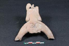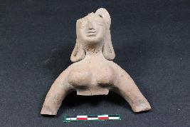 | Description / विवरण | Fragment of a female figurine wearing long kundalas with prominent eyes, pinched nose and lips. It has prominent bust with outretched hands having rough surface. |