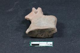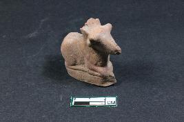| Description / विवरण | An animal figurine probably a cow in sitting posture with projected mouth and horns. It has ornamentation around its neck having rough surface. |