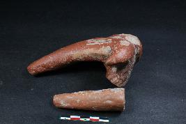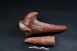 | Description / विवरण | Fragmentary Animal figurine with a prominent long leg and tail having smooth surface. It also has linear incisions at the back surface. It also has smaller leg fragment of an Animal figurine. |