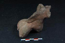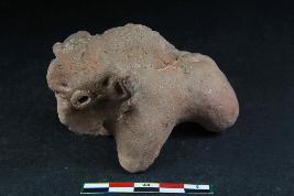 | Description / विवरण | A fragment of animal figurine probably a horse having long snout, pinhole nostrils, short ears, saddle on back, broken legs and rough surface. |