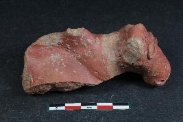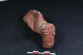 | Description / विवरण | Fragmentary Animal Figurine with prominent applique eyes marked by linear incision, snout along with slit mouth and nose marked by pin holes having rough surface. It also has series of pinholes around the neck probably denoting neckband and pinholes on the forehead. |