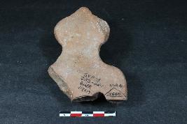 | Description / विवरण | Fragmentary female figurine with prominent trefoil hairstyle, eyes, pinched nose, lips and bust. It is wearing long kundalahaving rough surface. |
