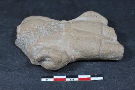 | Description / विवरण | Fragmentary human figurine with prominent marks of drapery having rough surface. |