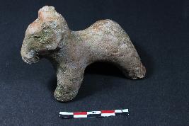 | Description / विवरण | A fragment of animal figurine having long snout, incised eyes, curved horns, broken outstreched legs and rough surface. |