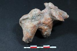 | Description / विवरण | A fragment of animal figurine having short snout, big ears, applique eyes, short stumpy legs, applique pinhole band on it s back and rough surface. |