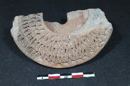 | Description / विवरण | Fragmentary stamp with decorated base and grooves on top having rough surface. |