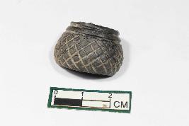 | Description / विवरण | Fragmentary ghut shape bead with incised cross design having rough surface. |