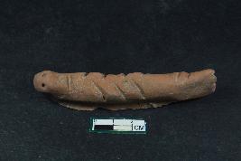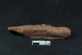 | Description / विवरण | Probably crocodile figurine with prominent pinholes eyes, slit mouth and incised lines on the surface. |