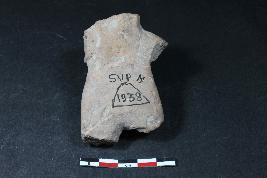 | Description / विवरण | Fragmentary female figurine with prominent breast, broken hands and legs having rough surface. |