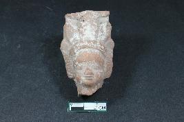 | Description / विवरण | Head of a human figurine with prominent headdress,eyes,nose and lips. It has leafy ornamentation in ears having rough surface. |