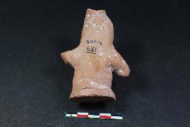 | Description / विवरण | Pedestaled Female figurine with traces of facial features, hairstyle marked by open hair, out streched arms and applique pointed bust having rough surface. |