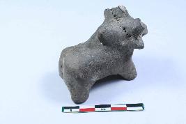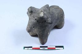 | Description / विवरण | Humped Bull Figurine with prominent pinched out ears and horns, protruded snout, eyes and nostrils marked by pinhole and short streched out stumpy legs having rough surface. It also has series of pinhole design. |