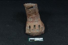 | Description / विवरण | Fragmentary foot of a human figurine with prominent fingers marked by deep incised lines having rough surfrace. |