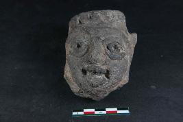 | Description / विवरण | Fragment head of human figurine with prominent eyes with holes with elongated eyebrows, nose,lips and headdess having rough surface. |