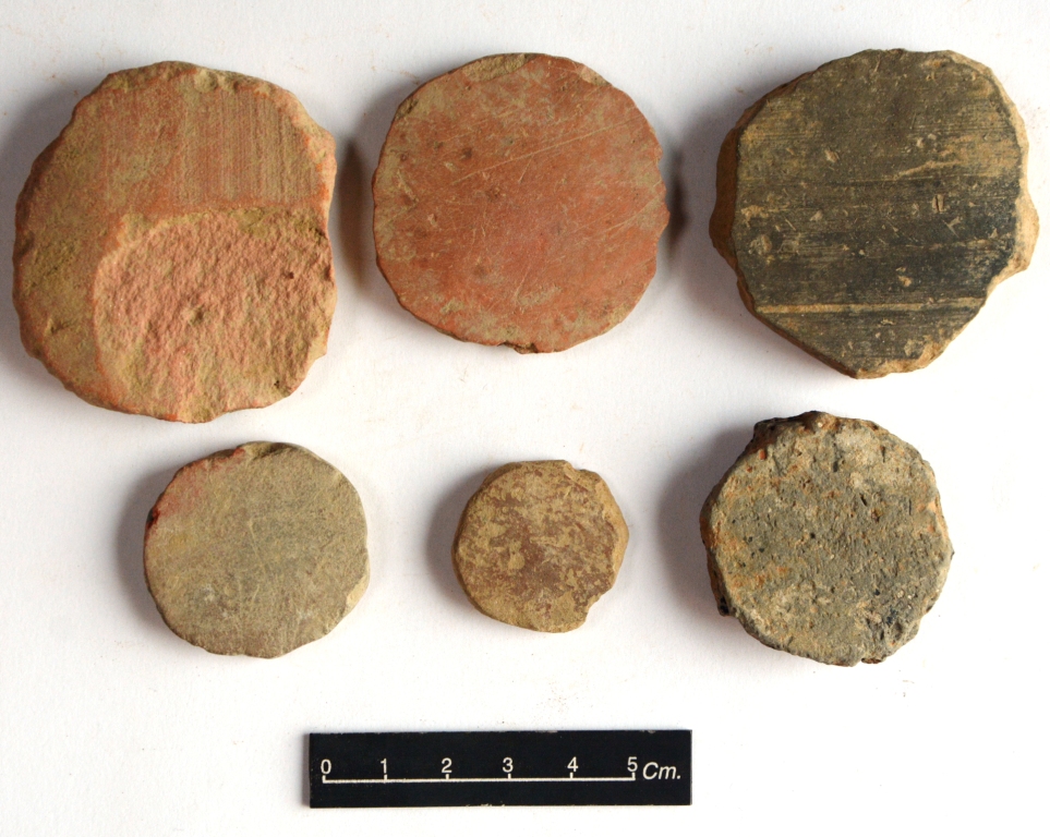 These are six hopscotch with damaged edges. Surface is devoid of any decoration.