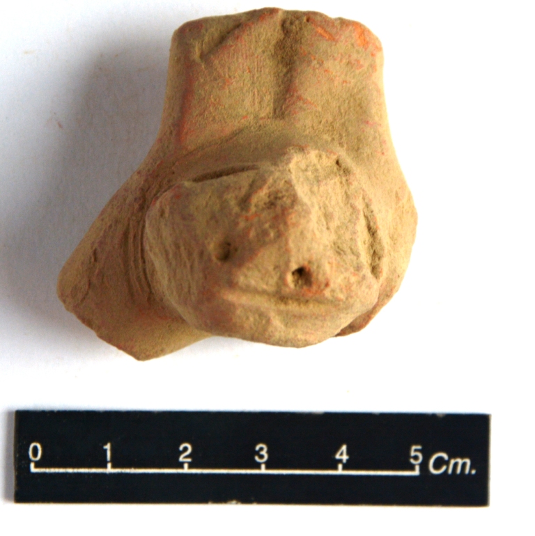 It is a fragment of an animal figurine having incised dotted eyes. Rest body is missing henceforth, its hard to name the animal.