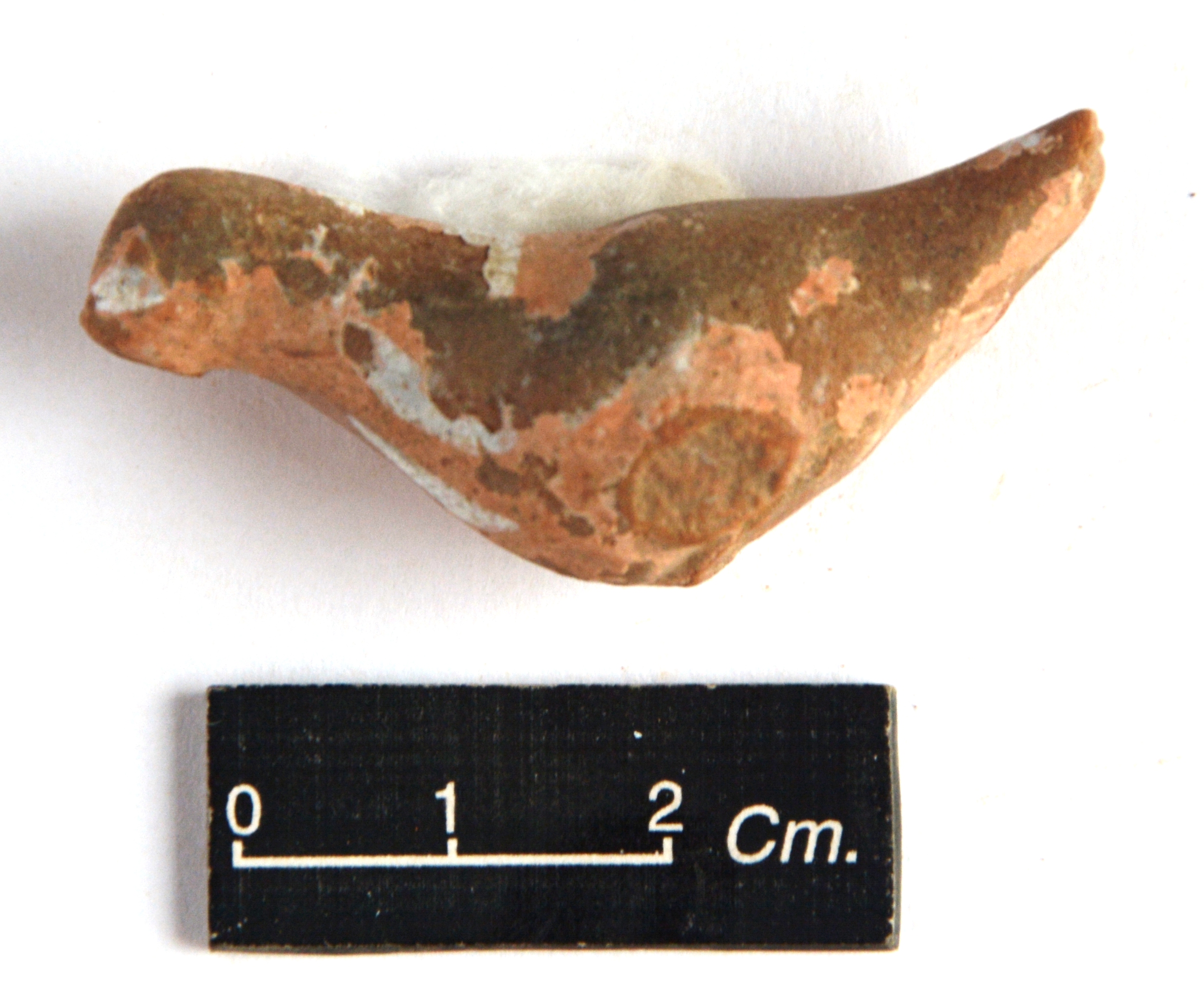 It is a terracotta bird with its beak and claws missing. Face of the bird is defaced. No ornamentation is observed on the surface of the figurine.