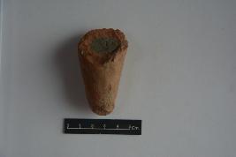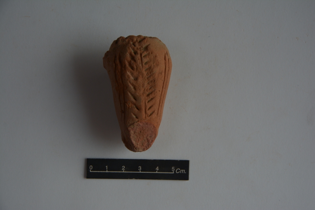 It is a fragment of a decorative item made of terracotta. Incised lines are marked in the shape of a leaf. Upper part of the object is broken.