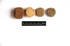 These are four terracotta hopscotch; devoid of any decoration on the surface.