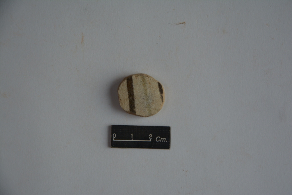 Terracotta hopscotch treated with white slip and decorated with two parallel lines in black on its surface.