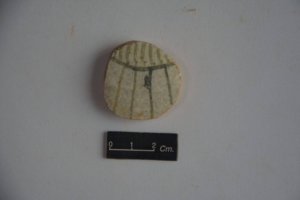 Terracotta hopscotch marked with white slip having parallel line decoration in black and green.