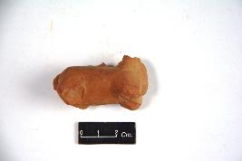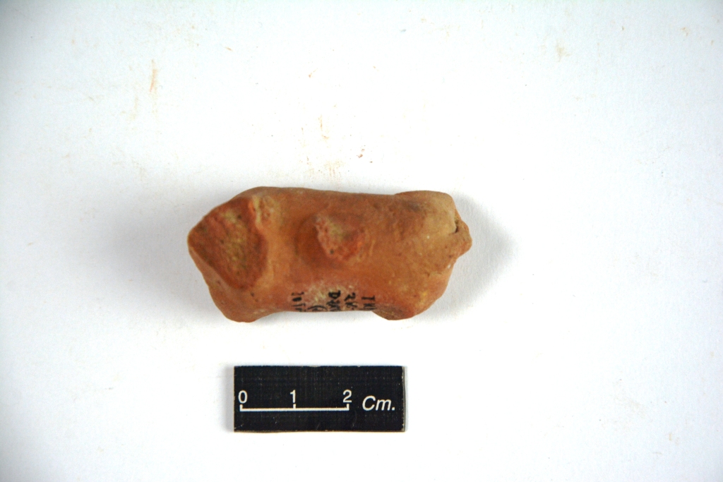 Terracotta animal torso; rest body is missing. Surface of the object is devoid of any decoration.A small broken tail is visible on the back of the seated animal.