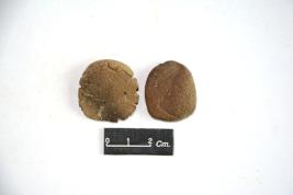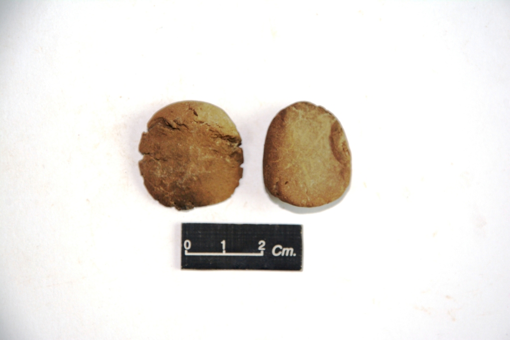 Two handmade terracotta hopscotch. Edges are damaged, rest surface is in good state. Surface is devoid of any treatment.