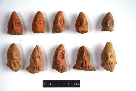 | Description / विवरण | These are terracotta human heads with pinching nose, applique circular eyes and helmets. Figures are adorned with incised lines to mark the bead. Body below the neck is broken. |