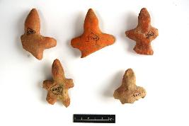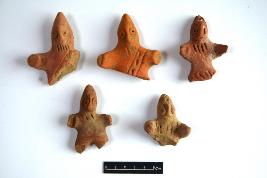 | Description / विवरण | There are five terracotta human figurine made by using pinching and applique technique with conical helmet.Beard is marked by incised line and cross belt are show on the chest.Body below the waist is broken. |