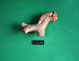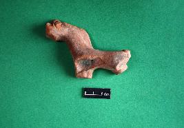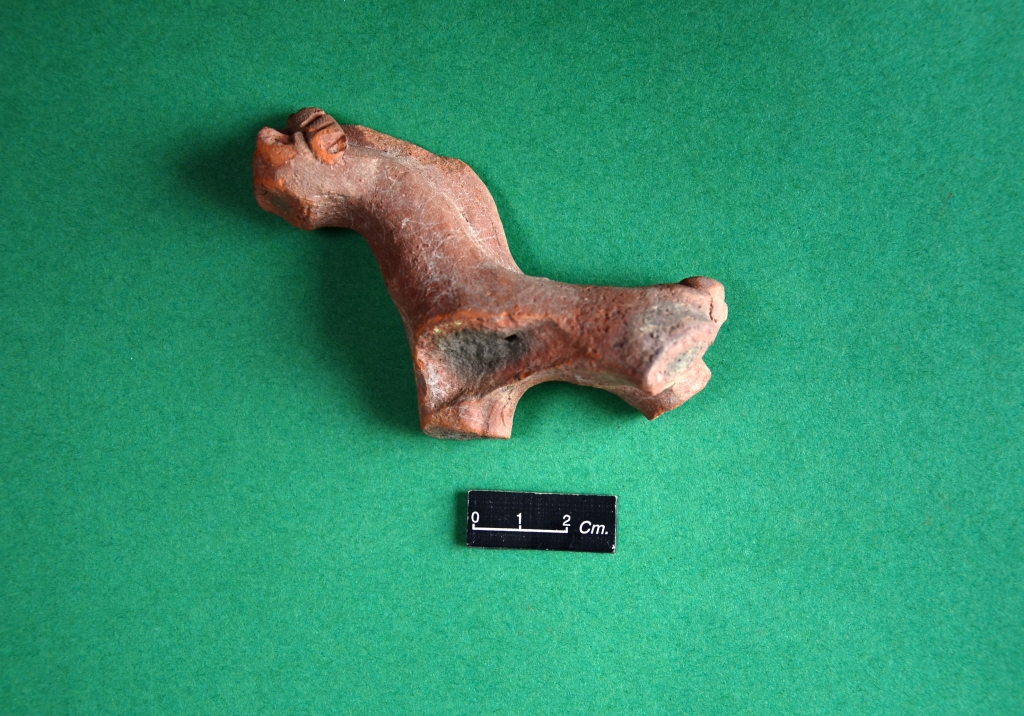 Damaged horse figurine in terracotta which is defaced with damaged limbs. An incised band like ornamentation is observed above the head part. Rest of the body is devoid of any decoration.