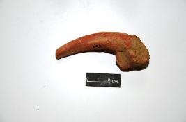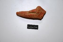 | Description / विवरण | Terracotta animal figurine with only a part of the tail surviving with incised decoration. Head, back and limbs are missing. |