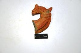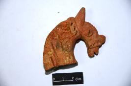 | Description / विवरण | Terracotta horse head with applique circular eyes, pointed ears and neck is marked with incised lines. An applique strap is observed around the mouth. Body is broken below neck. |