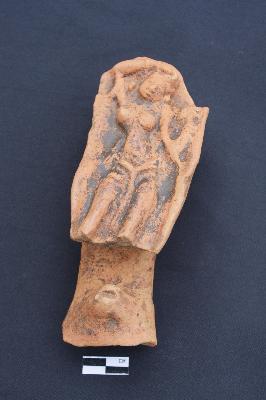 It is a terracotta plaque having depiction of standing nayika in tribhangamudra posture. She holds mirror in her left hand while by right hand she is combing her hair. She is adorned with earring, necklace and drapery.