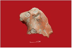 Terracotta animal head Horse having stamped circular eyes and hair shown by applique pinch method. Red slip on entire body.