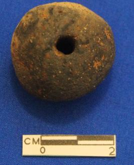 Short, biconic, truncated, circular bead, grayish core, medium grained.