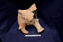 | Description / विवरण | It is a hollow broken elephant figurine having its head, trunk, tusk, ears, and the right leg. The physical parts are prominently shown. The forehead is broad and quite prominent. It has an internally curved broken trunk along with the tusk. The outer surface is worn out due to weathering. It is made of coarse clay mixed with sand. |