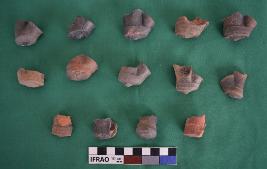 Lower part of broken chillum smoking pipe, red and black colour. Out of the total, six of them has polished surface. 11 numbers are decorated in the lower part with regular symmetrical incised lines in two rows. Most of them has pointed base, few has flat base. They are made of well levigated clay