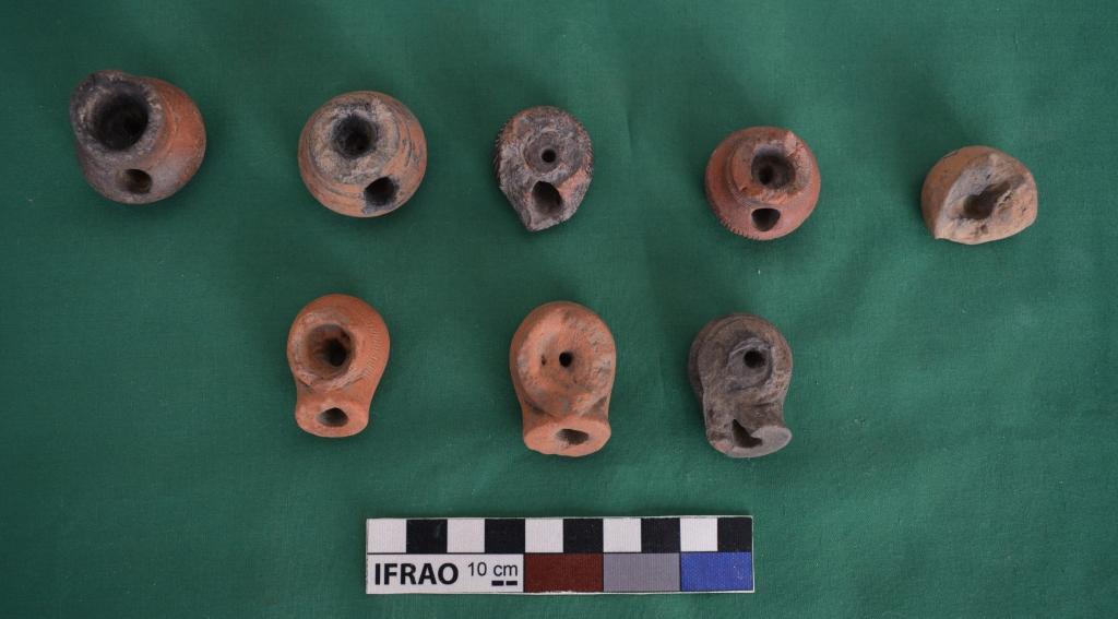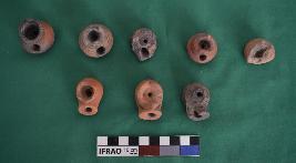 Lower part of chillum, red and black colour. All of them have a bulbous body with flat base. Two perforations at the top and front. Symmetrical vertical incised and dots decoration around the body. Made of well levigated clay