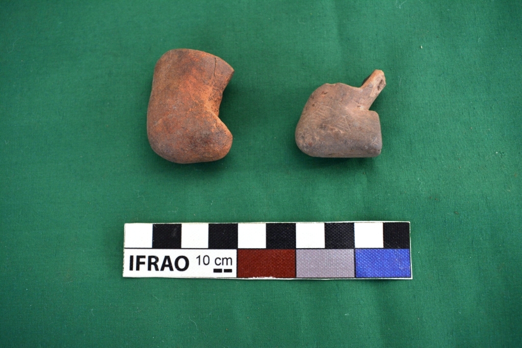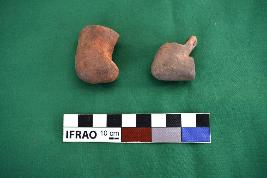 Two pieces of Terracotta chillum. One of the object mouth is wide open. There is no decoration on the surface. Short shank and big bowl chamber. Red in colour. It has round base. It has pointed base. Two Perforations, one at the shank and one at the top connected each other inside the chillum. whole chamber is broken. Both the smoking pipe are made of well levigated clay. Both are in the same shape, one object has a kind of sharp hook shape, and the other has short hook type.