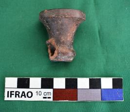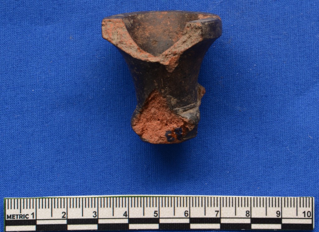 Terracotta Smoking pipe, black polished surface. It has flat bottom, long neck and flaring open mouth bowl. There is no decoration at the surface. Perforation at the front which must be used to connect the pipe . The smoking pipe is made of well levigated clay