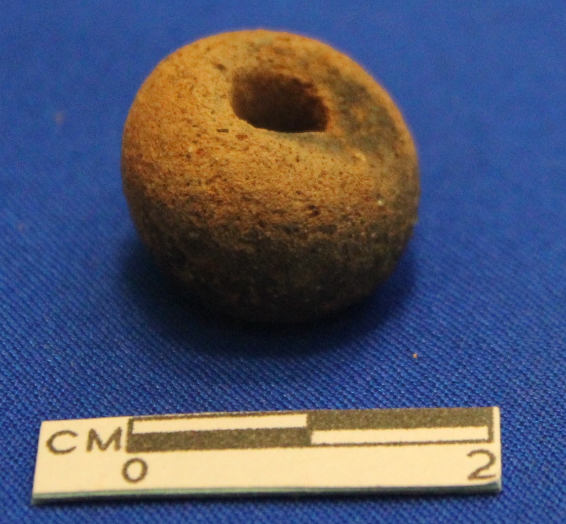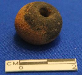 Short, barrel shaped, circular bead, reddish black, fine grained, ill fired.