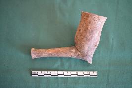 Terracotta smoking pipe, having a cylindrical shape of bowl with long shank. It is decorated with dots designs in five rows at the top of bowl, as well as the lower portion of the bowl is decorated with 10 rows of the same design. It is made of well levigated clay, light brown in colour.