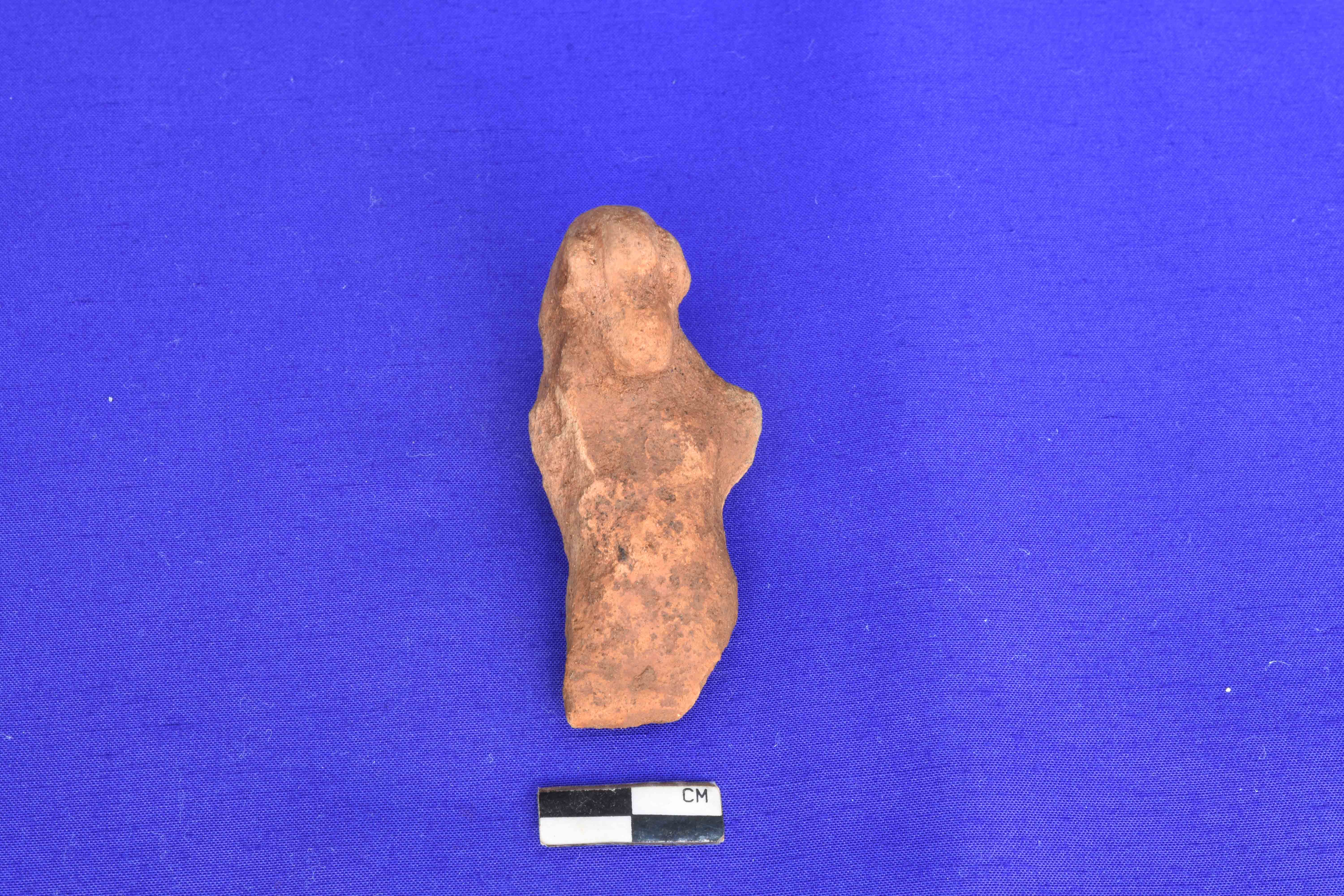 A TC figurine with applique eyes, elongated cheeks, both hands are broken and leg portion is also missing.