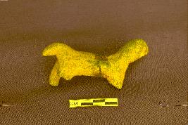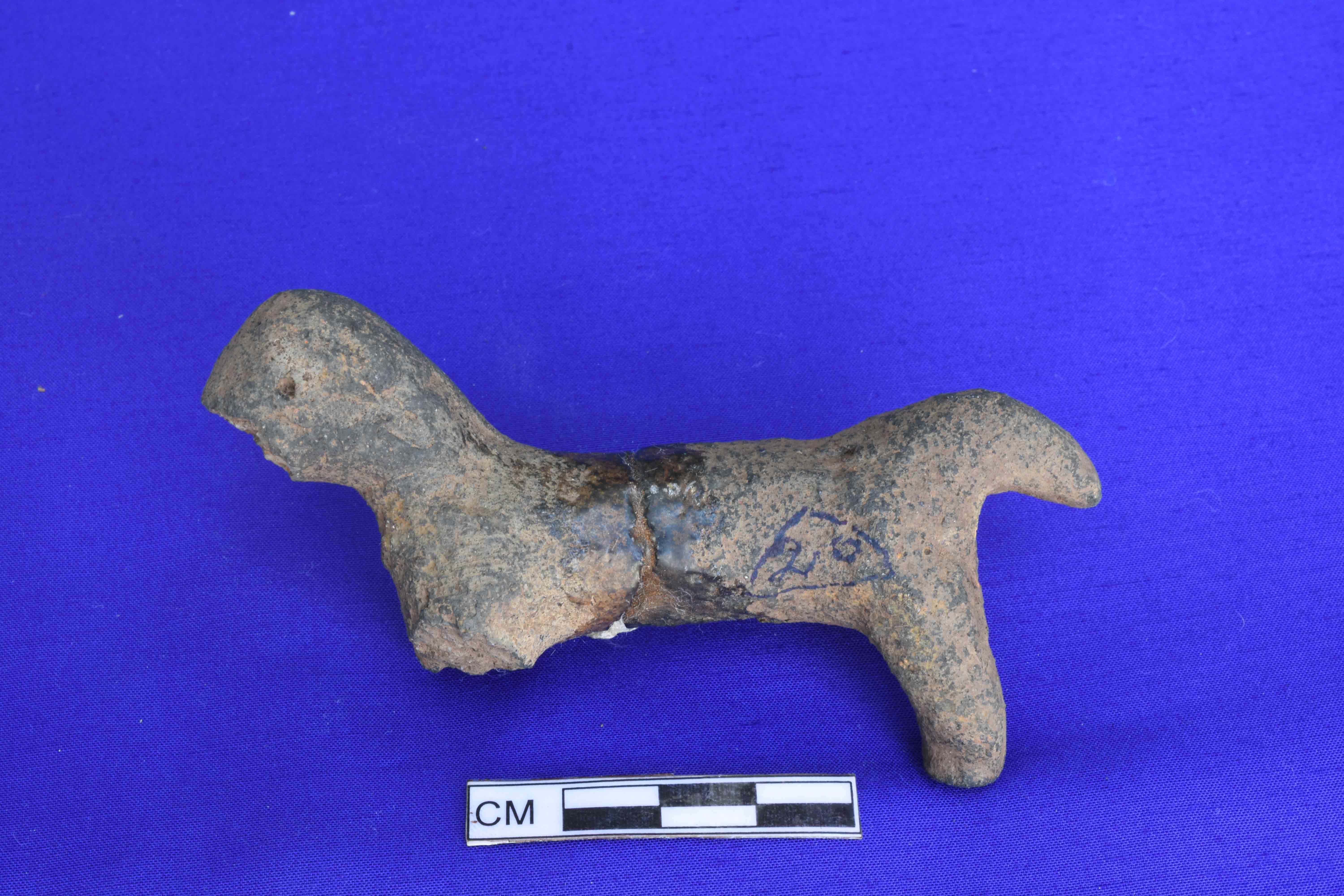 Animal figurine probably dog with two front and one right back leg completely broken and missing. The front portion of mouth Jaw is also missing. Tail is prominent.